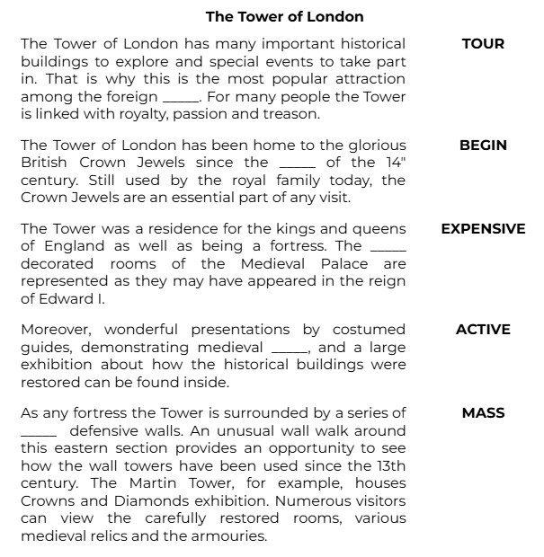 The Tower of London has many important historical buildings to explore and special events to take part in. That is why this is the most popular attraction among the foreign _____. For many people the Tower is linked with royalty, passion and treason. (TOUR)