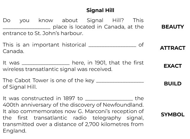 Do you know about Signal Hill? This __________________ place is located in Canada, at the entrance to St. John’s harbour. (BEAUTY)
