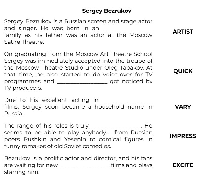 Sergey Bezrukov is a Russian screen and stage actor and singer. He was born in an __________________ family as his father was an actor at the Moscow Satire Theatre. (ARTIST)
