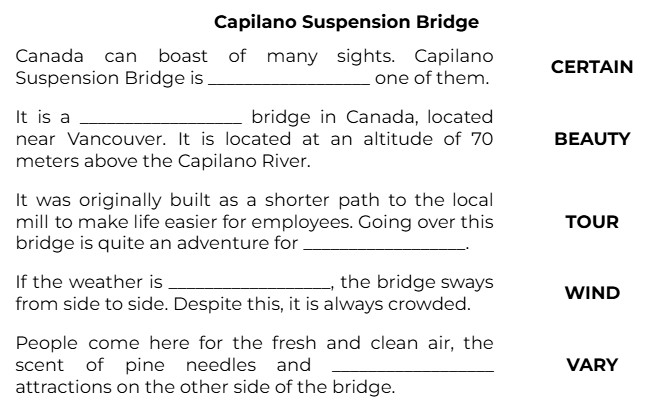 It is a __________________ bridge in Canada, located near Vancouver. It is located at an altitude of 70 meters above the Capilano River. (BEAUTY)