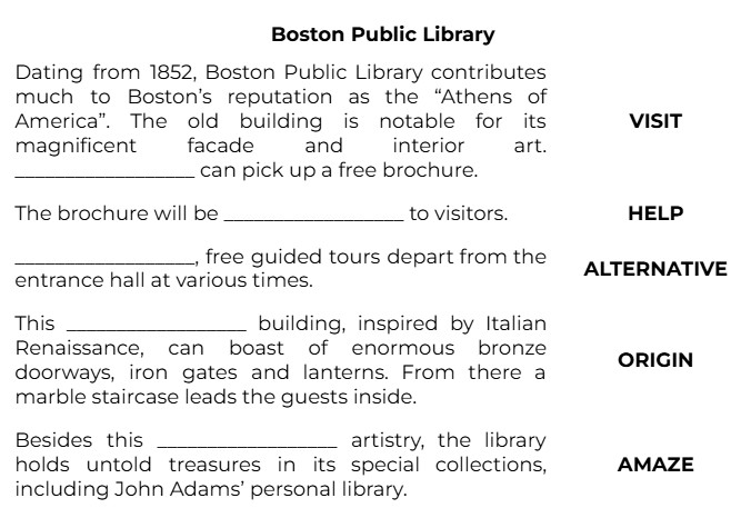 Dating from 1852, Boston Public Library contributes much to Boston’s reputation as the “Athens of America”. The old building is notable for its magnificent facade and interior art. __________________ can pick up a free brochure. (VISIT)