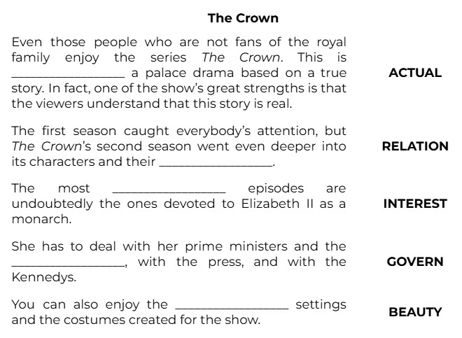 Even those people who are not fans of the royal family enjoy the series The Crown. This is __________________ a palace drama based on a true story. In fact, one of the show’s great strengths is that the viewers understand that this story is real. (ACTUAL)