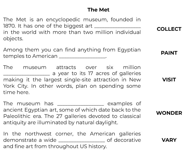 The Met is an encyclopedic museum, founded in 1870. It has one of the biggest art __________________ in the world with more than two million individual objects. (COLLECT)