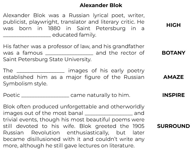 Alexander Blok was a Russian lyrical poet, writer, publicist, playwright, translator and literary critic. He was born in 1880 in Saint Petersburg in a __________________ educated family. (HIGH)