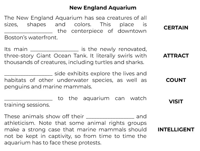 The New England Aquarium has sea creatures of all sizes, shapes and colors. This place is __________________ the centerpiece of downtown Boston’s waterfront. (CERTAIN)