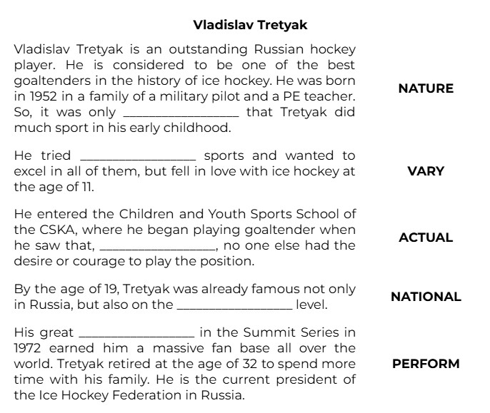 Vladislav Tretyak is an outstanding Russian hockey player. He is considered to be one of the best goaltenders in the history of ice hockey. He was born in 1952 in a family of a military pilot and a PE teacher. So, it was only __________________ that Tretyak did much sport in his early childhood. (NATURE)