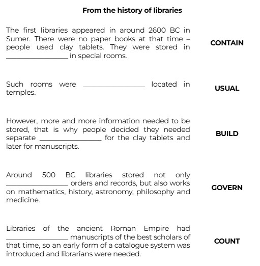 The first libraries appeared in around 2600 BC in Sumer. There were no paper books at that time – people used clay tablets. They were stored in __________________ in special rooms. (CONTAIN)