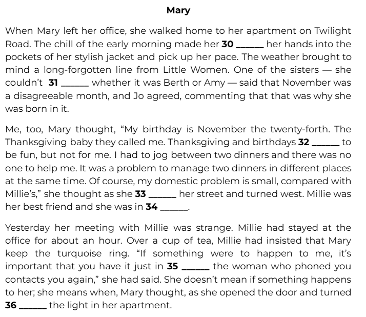 When Mary left her office, she walked home to her apartment on Twilight Road. The chill of the early morning made her 30 ______ her hands into the pockets of her stylish jacket and pick up her pace. The weather brought to mind a long-forgotten line from Little Women.