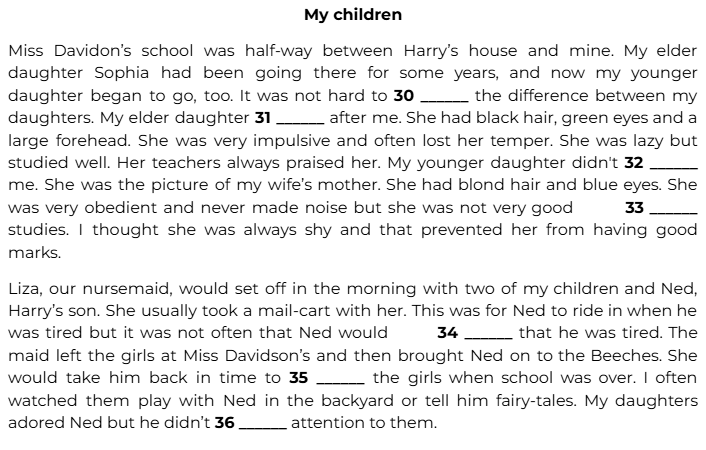 Miss Davidon’s school was half-way between Harry’s house and mine. My elder daughter Sophia had been going there for some years, and now my younger daughter began to go, too. It was not hard to 30 ______ the difference between my daughters.