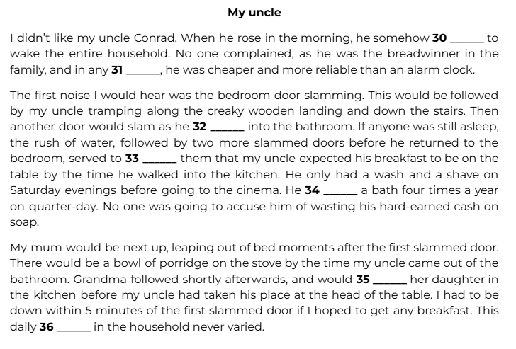 The first noise I would hear was the bedroom door slamming. This would be followed by my uncle tramping along the creaky wooden landing and down the stairs. Then another door would slam as he 32 ______ into the bathroom.