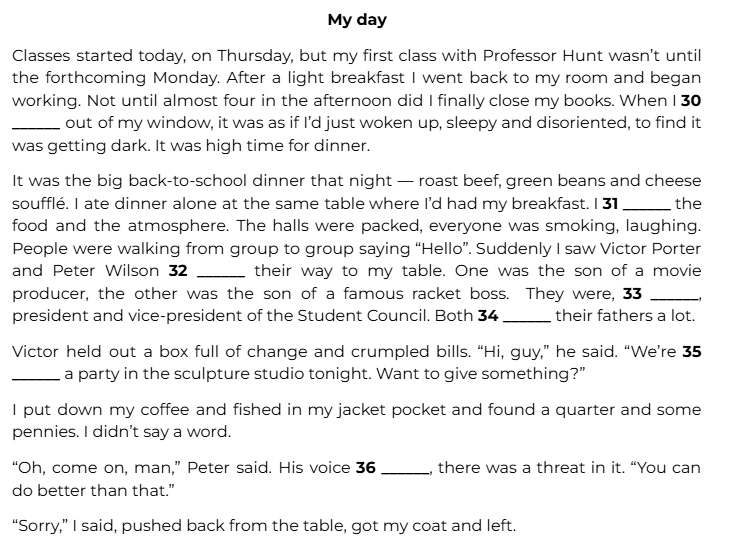 When I 30 ______ out of my window, it was as if I’d just woken up, sleepy and disoriented, to find it was getting dark.
