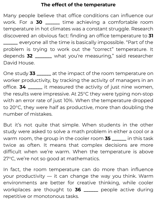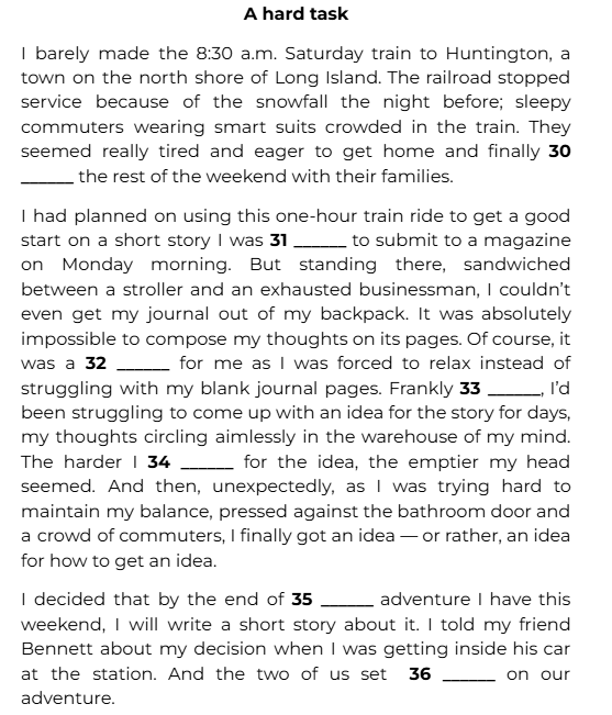 Прочитайте текст с пропусками, обозначенными номерами 30-36. Эти номера соответствуют заданиям 30-36, в которых представлены возможные варианты ответов. Отметьте цифру 1, 2, 3 или 4, соответствующую выбранному Вами варианту ответа.