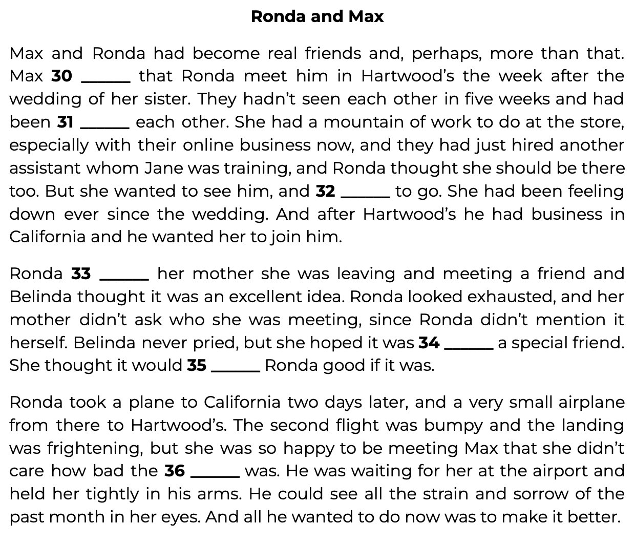 Max 30 ______ that Ronda meet him in Hartwood’s the week after the wedding of her sister.