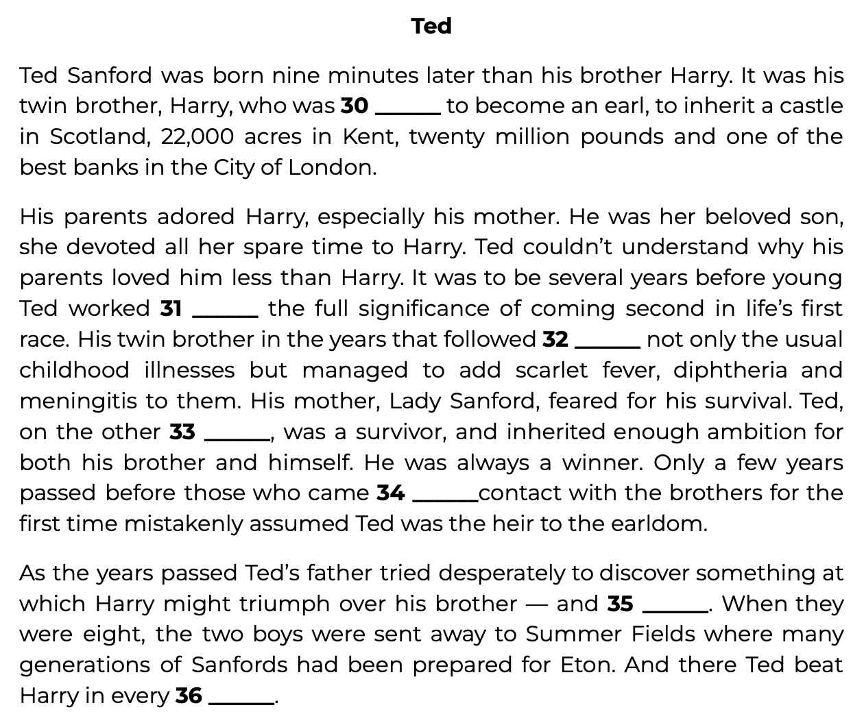 It was his twin brother, Harry, who was 30 ______ to become an earl, to inherit a castle in Scotland, 22,000 acres in Kent, twenty million pounds and one of the best banks in the City of London.