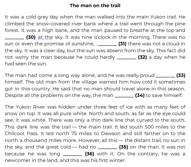He climbed the snow-covered river bank where a trail went through the pine forest. It was a high bank, and the man paused to breathe at the top and ________ (30) at the sky.