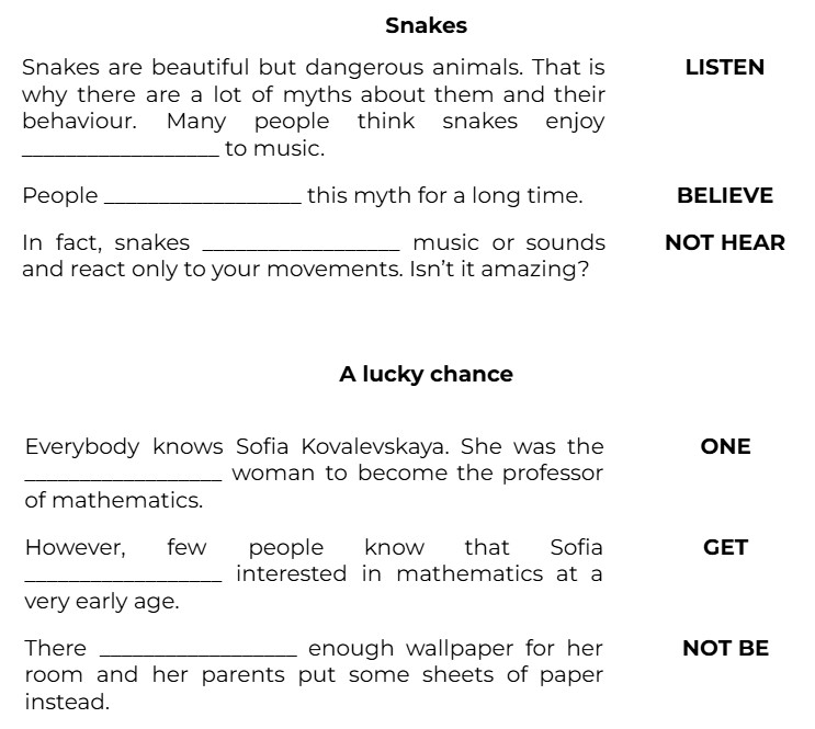 Snakes are beautiful but dangerous animals. That is why there are a lot of myths about them and their behaviour. Many people think snakes enjoy __________________ to music. (LISTEN)