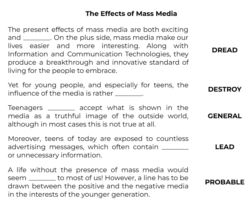 The present effects of mass media are both exсiting and ________. On the plus side, mass media make our lives easier and more interesting. Along with Information and Communication Technologies, they produce a breakthrough and innovative standard of living for the people to embrace. (DREAD)