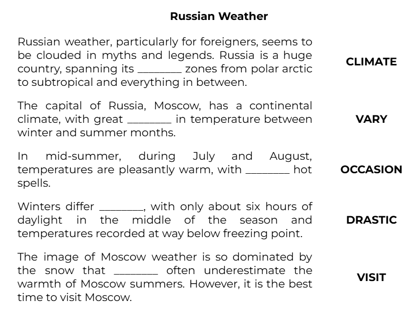Russian weather, particularly for foreigners, seems to be clouded in myths and legends. Russia is a huge country, spanning its ________ zones from polar arctic to subtropical and everything in between. (CLIMATE)