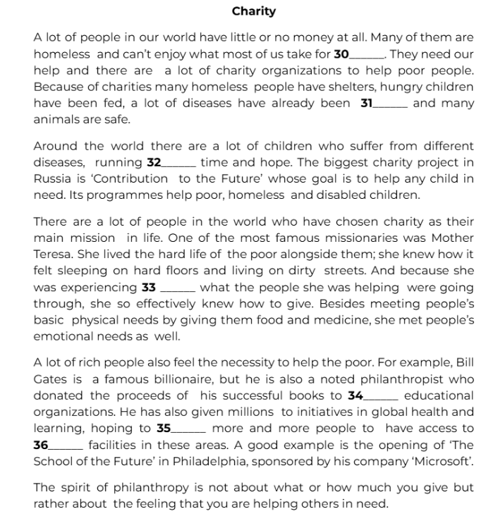 For example, Bill Gates is a famous billionaire, but he is also a noted philanthropist who donated the proceeds of his successful books to 34______ educational organizations.