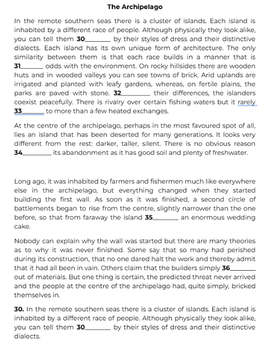 Прочитайте текст с пропусками, обозначенными номерами 30-36. Эти номера соответствуют заданиям 30-36, в которых представлены возможные варианты ответов. Отметьте цифру 1, 2, 3 или 4, соответствующую выбранному Вами варианту ответа.