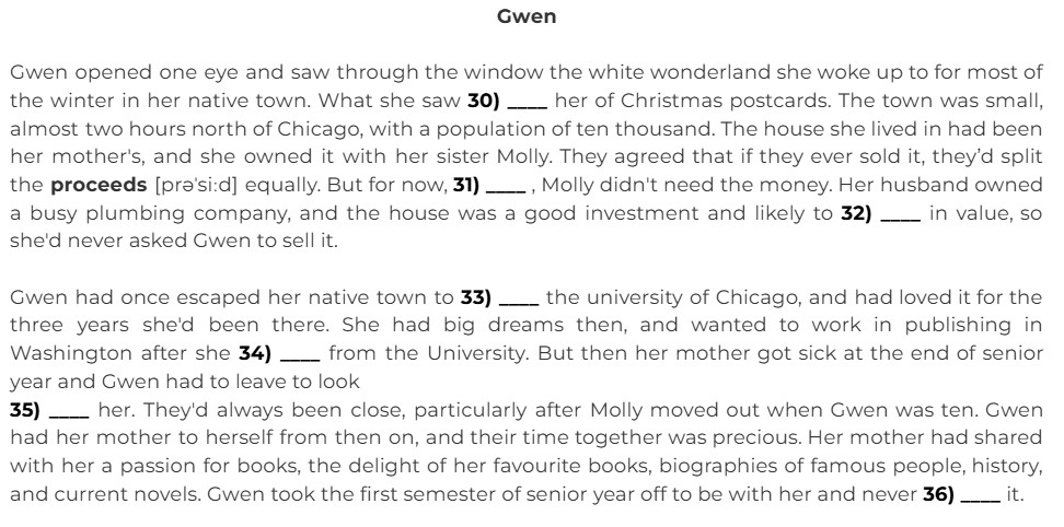 They agreed that if they ever sold it, they’d split the proceeds [prəˈsiːd] equally. But for now, 31) ____ , Molly didn't need the money.