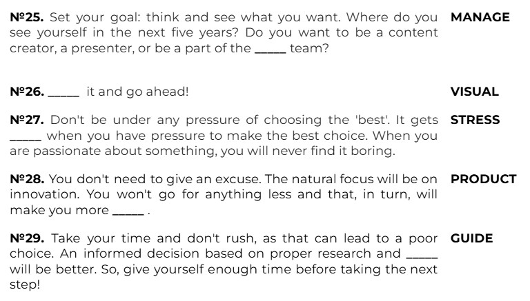 Set your goal: think and see what you want. Where do you see yourself in the next five years? Do you want to be a content creator, a presenter, or be a part of the _____ team? (MANAGE)