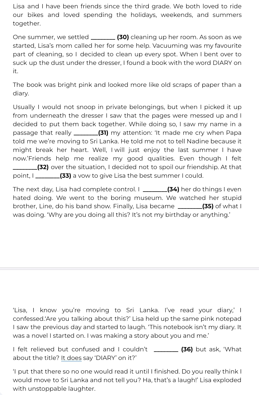 One summer, we settled ________ (30) cleaning up her room. As soon as we started, Lisa’s mom called her for some help. Vacuuming was my favourite part of cleaning, so I decided to clean up every spot. When I bent over to suck up the dust under the dresser, I found a book with the word DIARY on it.