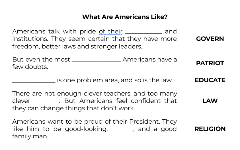 Americans talk with pride of their ____________ and institutions. They seem certain that they have more freedom, better laws and stronger leaders. (GOVERN)