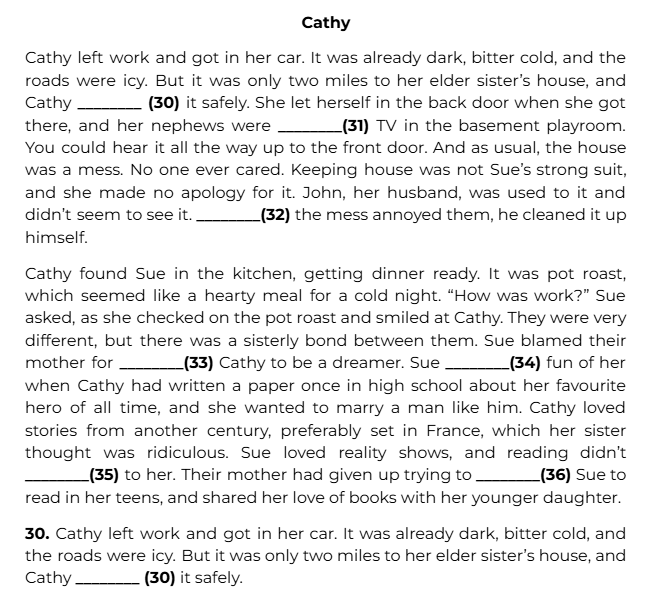 Cathy left work and got in her car. It was already dark, bitter cold, and the roads were icy. But it was only two miles to her elder sister’s house, and Cathy ________ (30) it safely.