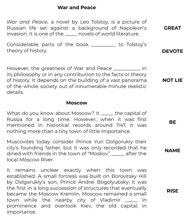 War and Peace, a novel by Leo Tolstoy, is a picture of Russian life set against a background of Napoleon’s invasion. It is one of the _____ novels of world literature. (GREAT)