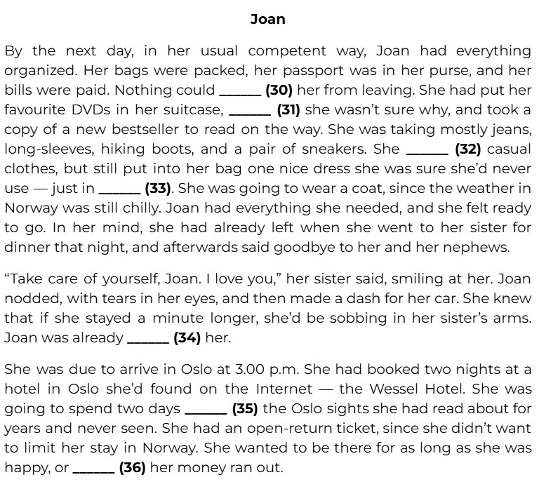 She ______ (32) casual clothes, but still put into her bag one nice dress she was sure she’d never use — just in ______ (33). She was going to wear a coat, since the weather in Norway was still chilly. Joan had everything she needed, and she felt ready to go. In her mind, she had already left when she went to her sister for dinner that night, and afterwards said goodbye to her and her nephews.