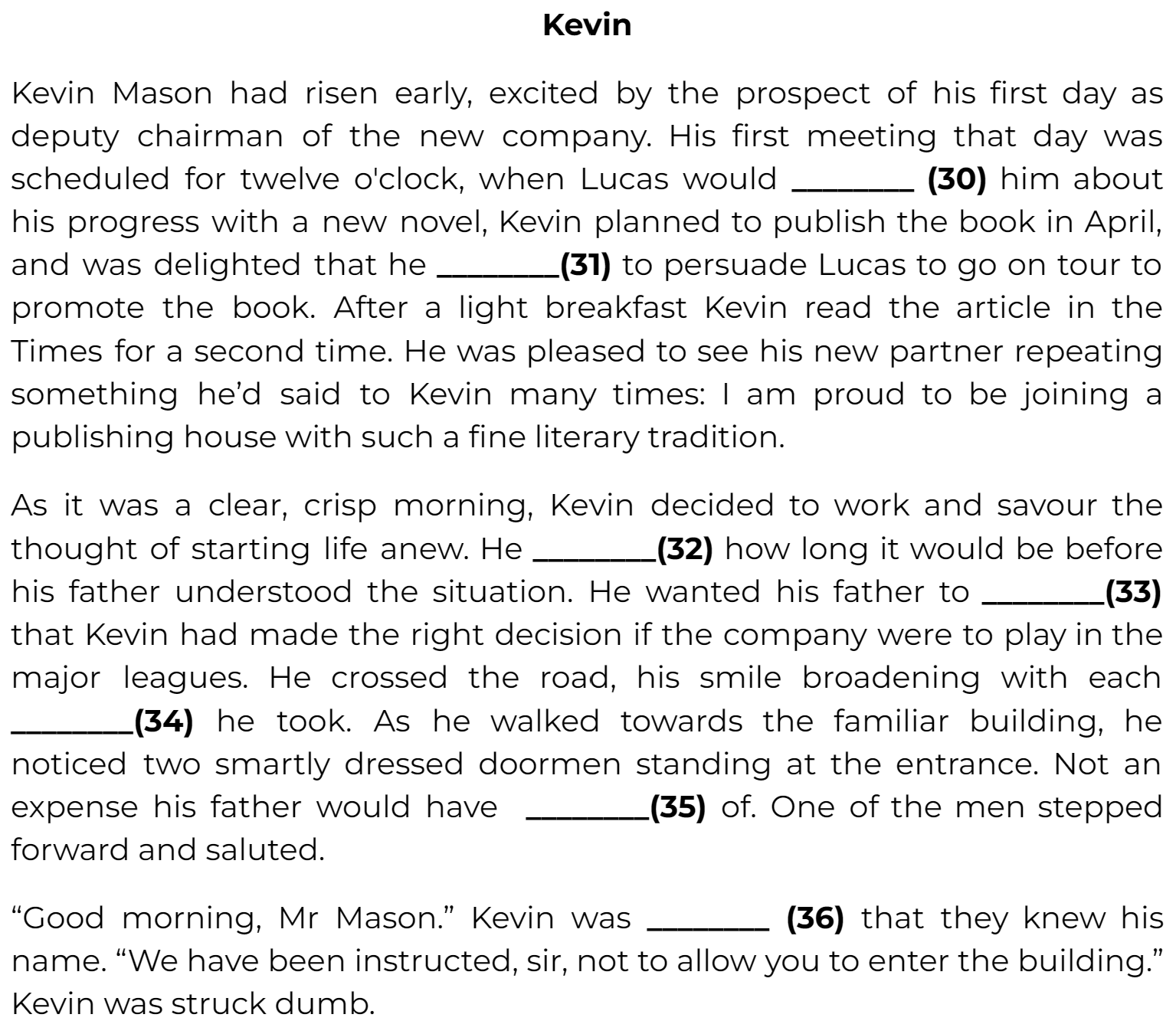 Kevin Mason had risen early, excited by the prospect of his first day as deputy chairman of the new company. His first meeting that day was scheduled for twelve o'clock, when Lucas would ________ (30) him about his progress with a new novel, Kevin planned to publish the book in April, and was delighted that he ________(31) to persuade Lucas to go on tour to promote the book.