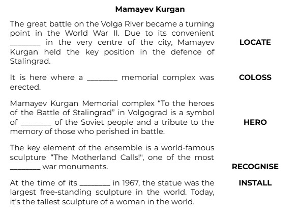 The great battle on the Volga River became a turning point in the World War II. Due to its convenient ________ in the very centre of the city, Mamayev Kurgan held the key position in the defence of Stalingrad. (LOCATE)