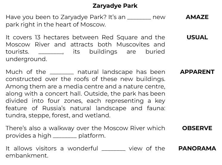 Have you been to Zaryadye Park? It’s an ________ new park right in the heart of Moscow. (AMAZE)