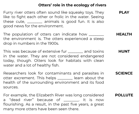 Furry river otters often sound like squeaky toys. They like to fight each other or frolic in the water. Seeing these cute, ________ animals is good fun. It is also good news for the environment. (PLAY)
