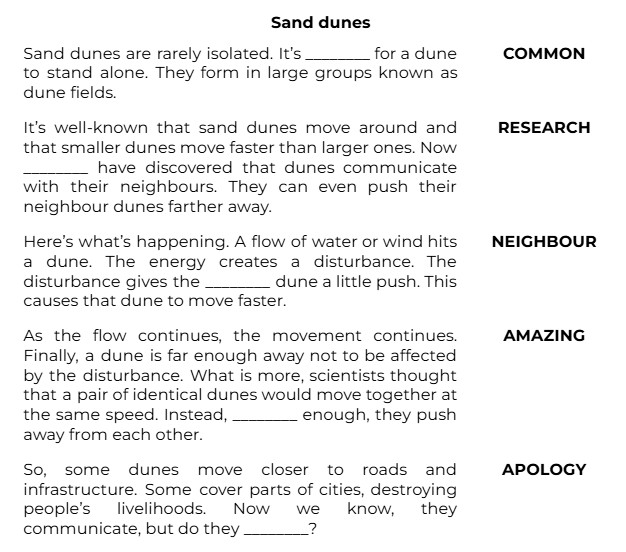 It’s well-known that sand dunes move around and that smaller dunes move faster than larger ones. Now ________ have discovered that dunes communicate with their neighbours. They can even push their neighbour dunes farther away. (RESEARCH)