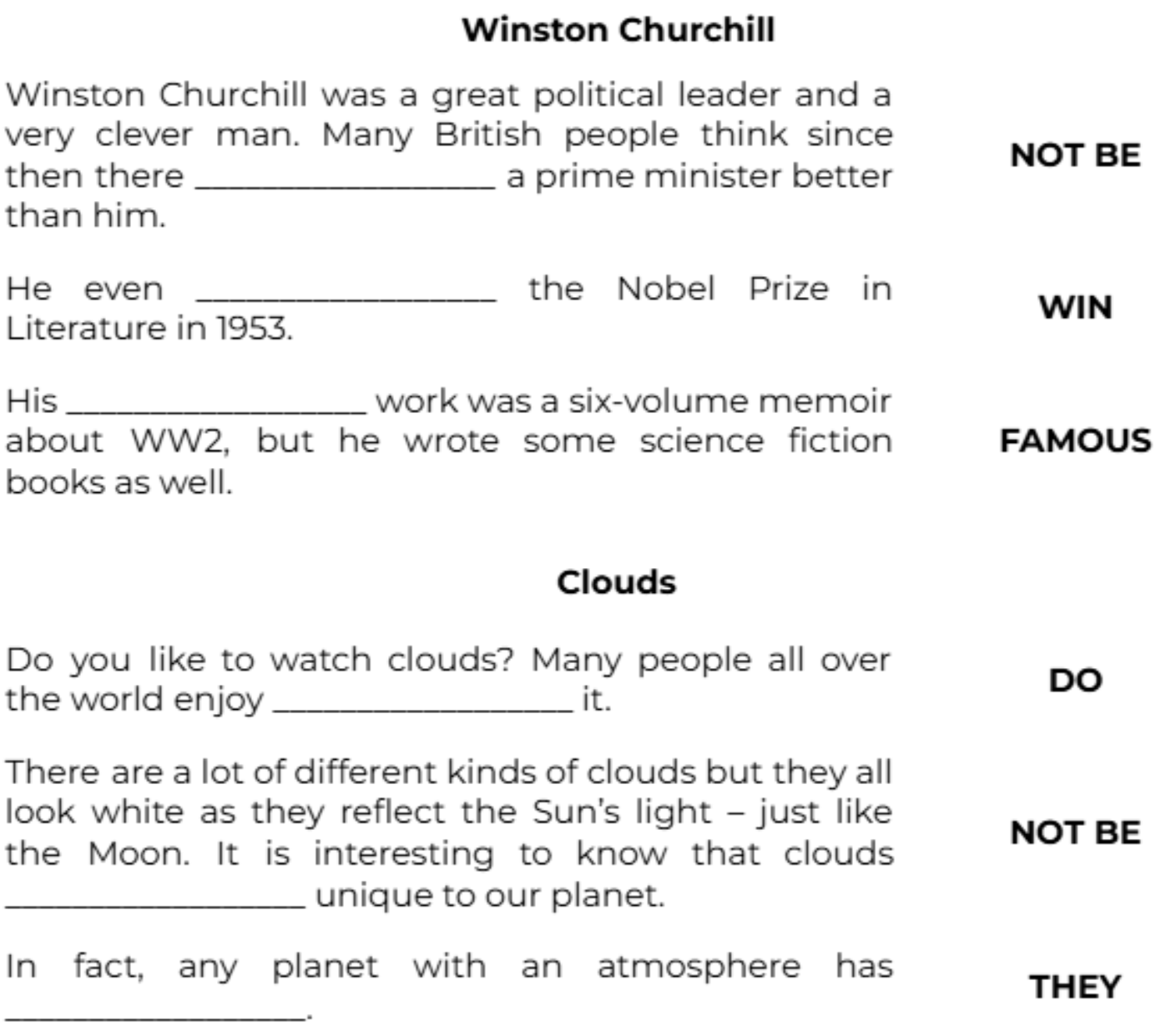 There are a lot of different kinds of clouds but they all look white as they reflect the Sun’s light – just like the Moon. It is interesting to know that clouds __________________ unique to our planet. (NOT BE)