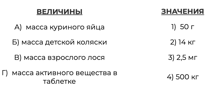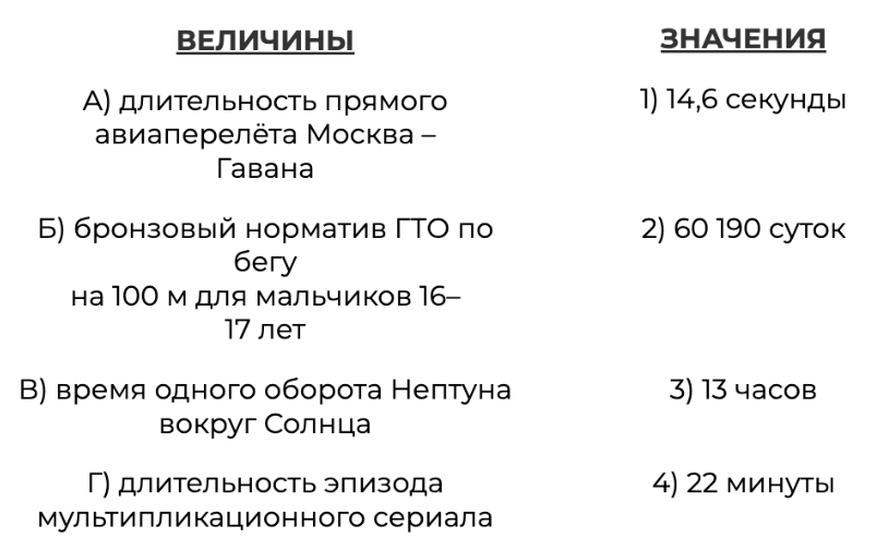 Установите соответствие между величинами и их возможными значениями: к каждому элементу первого столбца подберите соответствующий элемент из второго столбца.