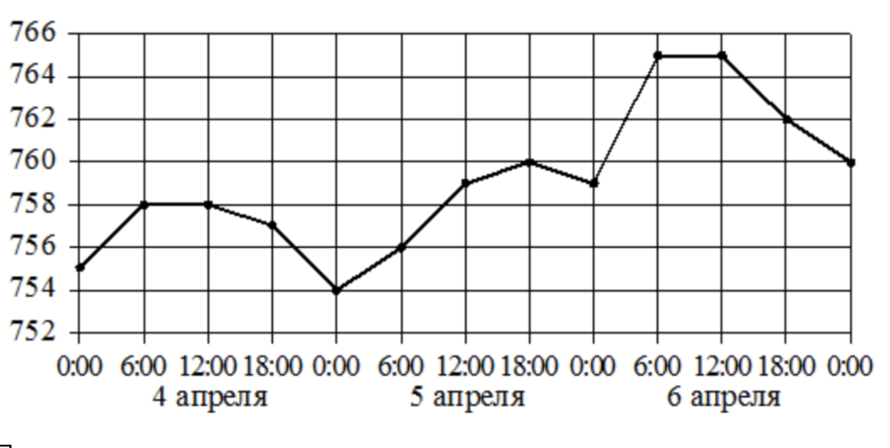 На рисунке точками показано атмосферное давление в некотором городе на протяжении трёх суток, с 4 по 6 апреля 2013 года. В течение суток давление измеряется 4 раза: в 0:00, в 6:00, в 12:00 и в 18:00. По горизонтали указаны время и дата, по вертикали — давление в миллиметрах ртутного столба. Для наглядности точки соединены линиями.