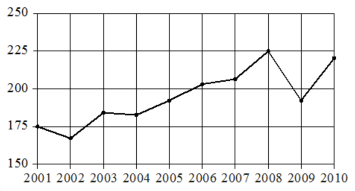 На рисунке точками показан годовой объём добычи угля в России открытым способом в период с 2001 по 2010 год. По горизонтали указывается год, по вертикали — объём добычи угля в миллионах тонн. Для наглядности точки соединены линиями.