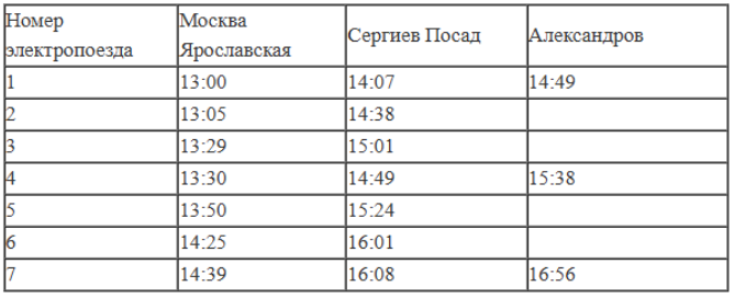 В таблице показано расписание пригородных электропоездов по направлению Москва Ярославская – Сергиев Посад – Александров.