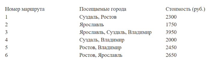 Путешественник из Москвы хочет посетить 4 города Золотого кольца России: Владимир, Ярославль, Суздаль и Ростов Великий. Турагентство предлагает маршруты с посещением некоторых городов Золотого кольца. Сведения о стоимости билетов и маршрутах представлены в таблице.
