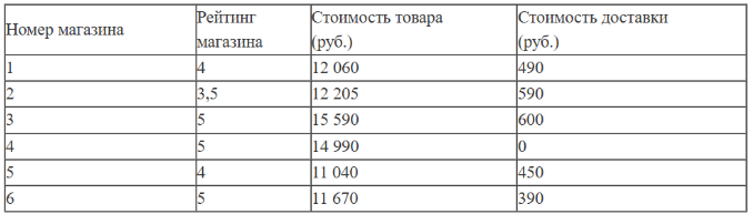 Сергей Петрович хочет купить в интернет-магазине микроволновую печь определённой модели. В таблице показано 6 предложений от разных интернет-магазинов.
