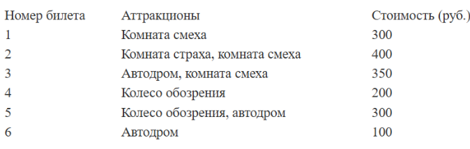 Михаил решил посетить Парк аттракционов. Сведения о билетах на аттракционы представлены в таблице. Некоторые билеты позволяют посетить сразу два аттракциона.