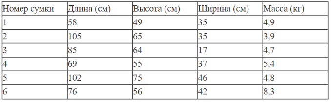 В таблице приведены данные о шести сумках.