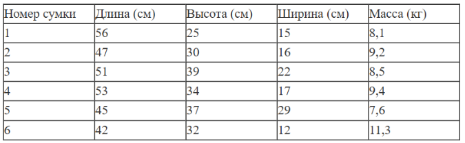 По правилам авиакомпании в ручную кладь может быть взята сумка, сумма трёх измерений (длина, высота, ширина) которой не превышает 203 см, а масса не превышает 5 кг. Какие сумки можно взять в ручную кладь по правилам этой авиакомпании?