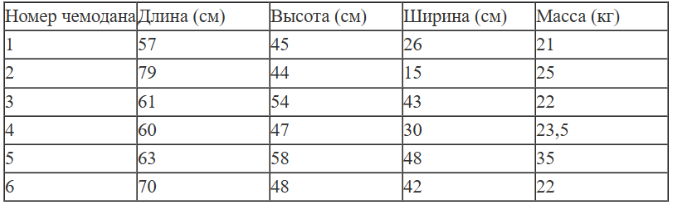 В таблице приведены данные о шести чемоданах.