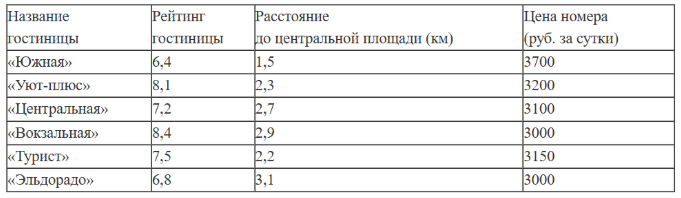 Любовь Игнатьевна собирается в туристическую поездку на трое суток в некоторый город. В таблице дана информация о гостиницах в этом городе со свободными номерами на время её поездки.