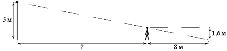 На каком расстоянии (в метрах) от фонаря стоит человек ростом 1,6 м, если длина его тени равна 8 м, высота фонаря 5 м?