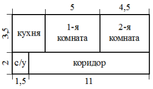 Квартира состоит из двух комнат, кухни, коридора и санузла (см. чертёж). Первая комната имеет размеры 3,5 м × 5 м, вторая — 3,5 м × 4,5 м, санузел имеет размеры 2 м × 1,5 м, длина коридора 11 м. Найдите площадь кухни (в квадратных метрах).